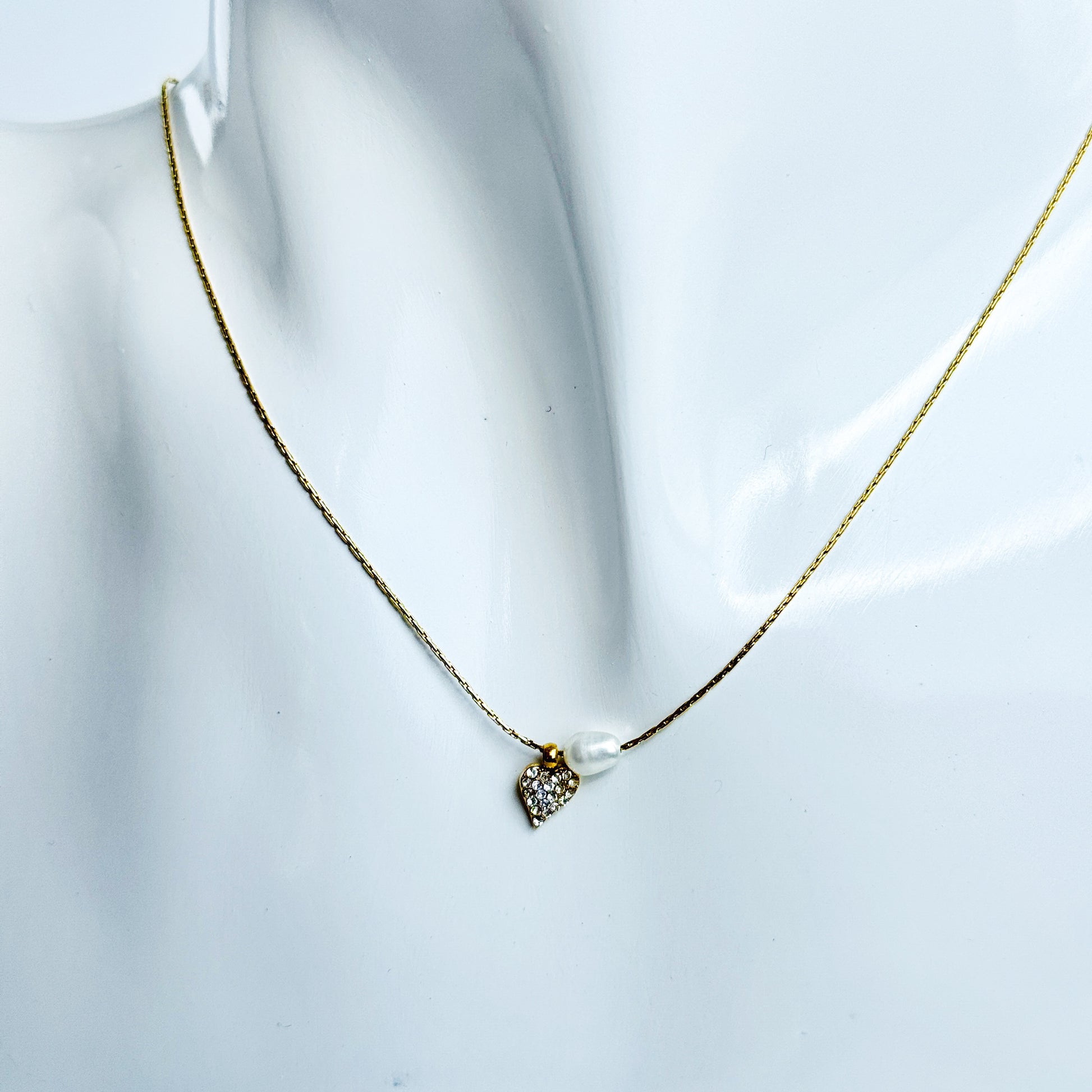 Cadena minimalista, tiene un dije de corazón con brillantes y una perlita. Mide 40 cms.