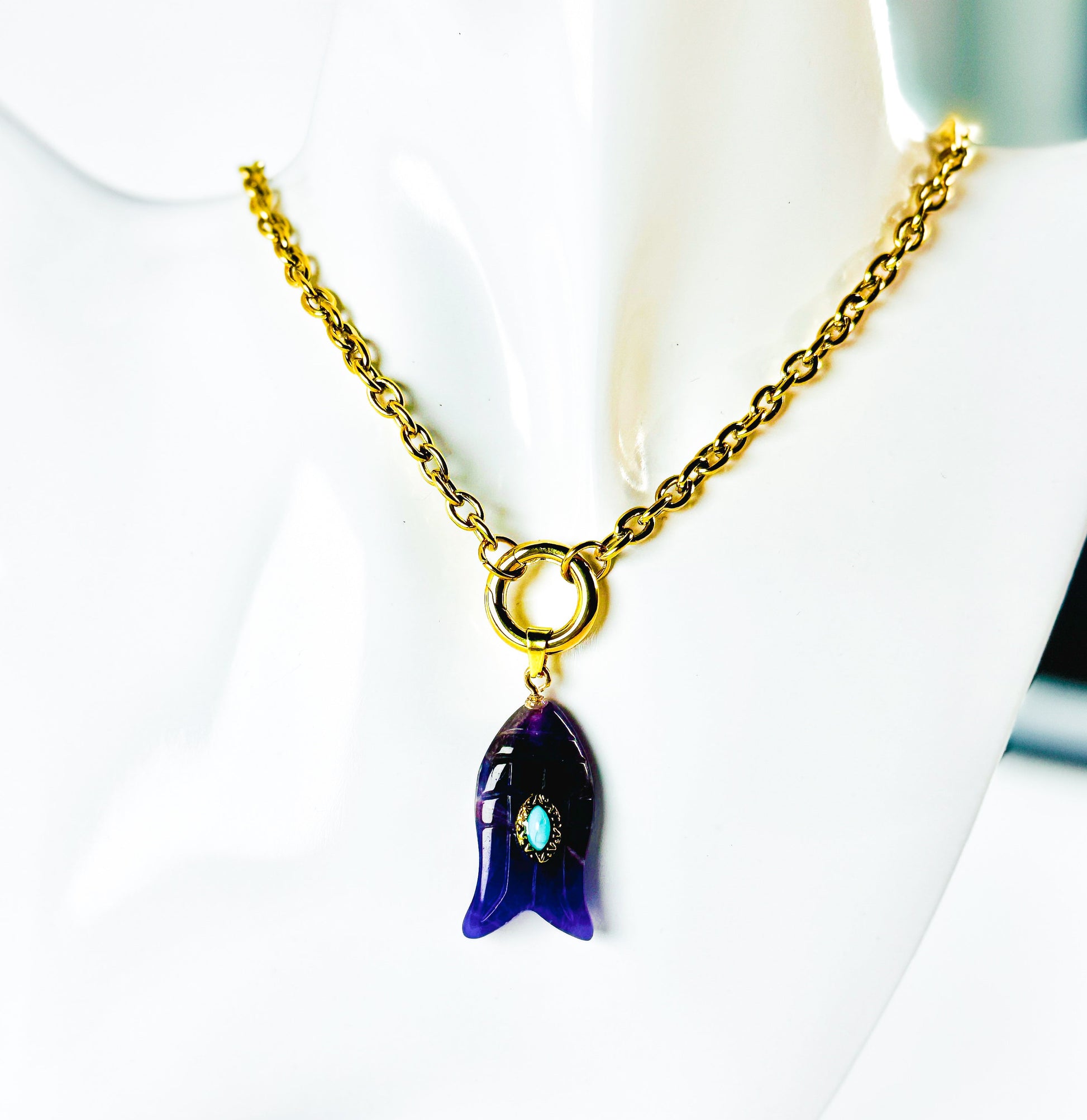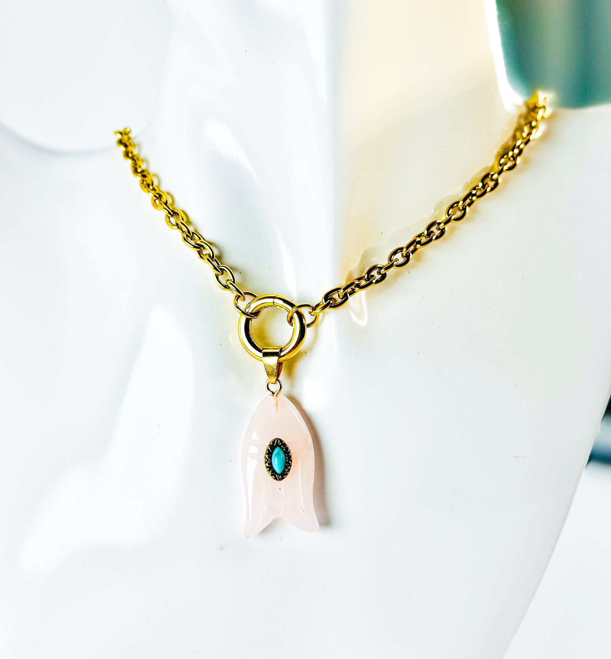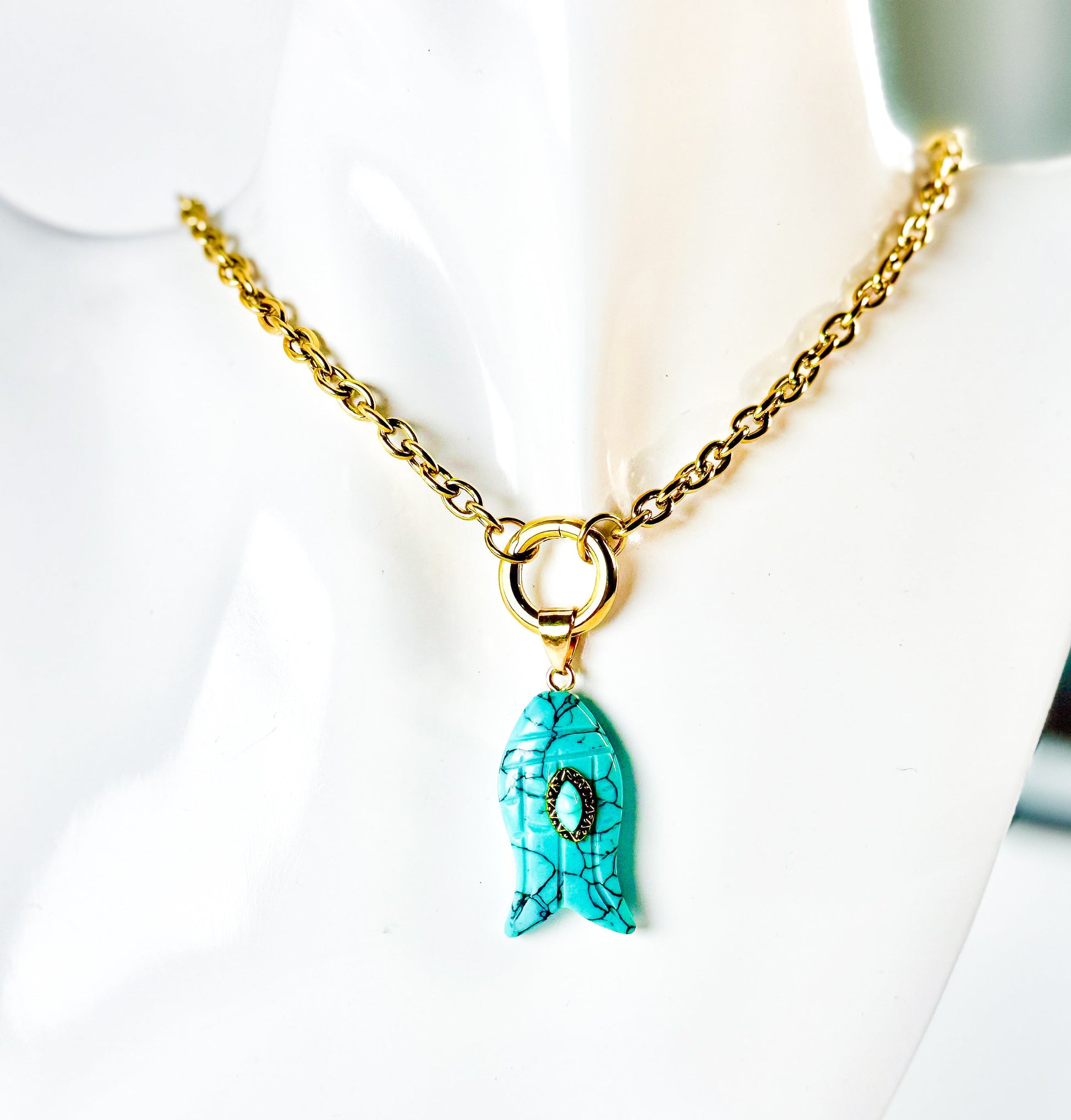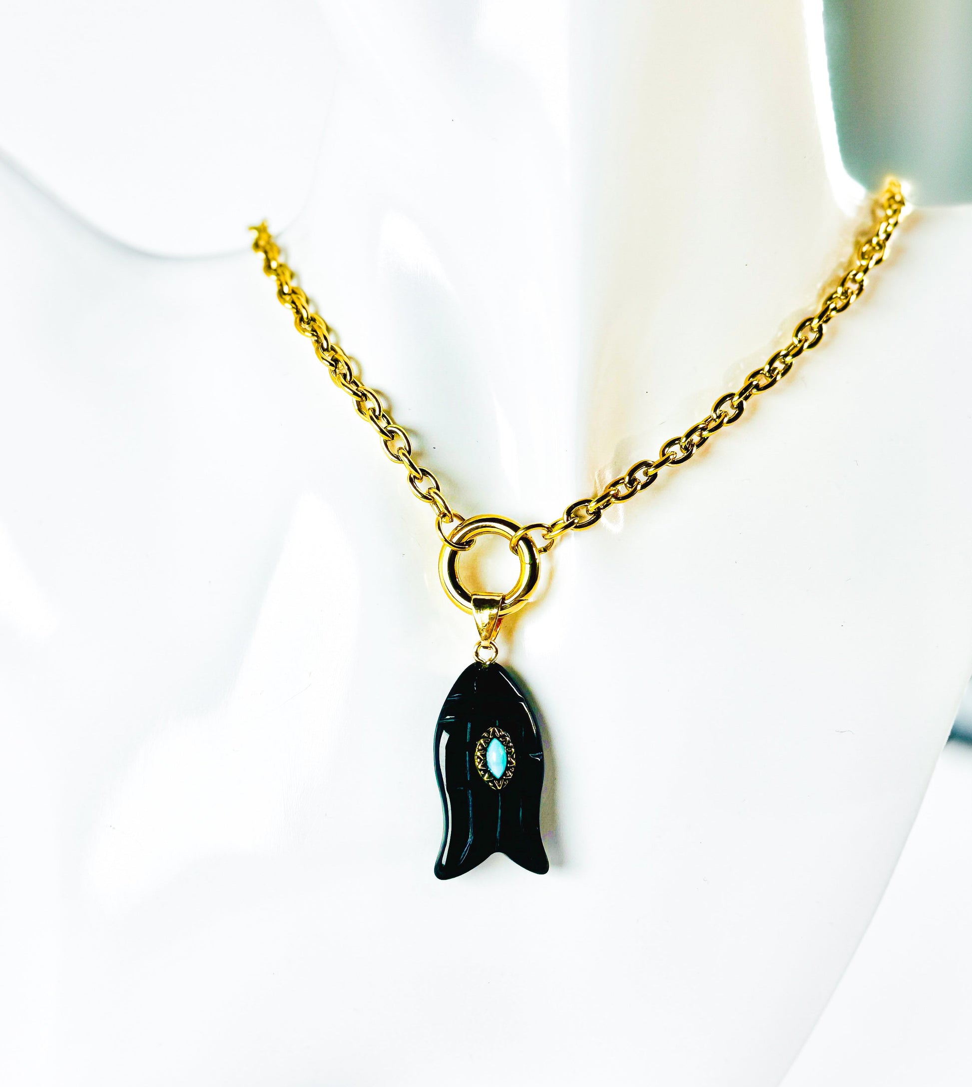 Cadena de acero inoxidable con broche decorativo, con dije de pez de piedra natural.